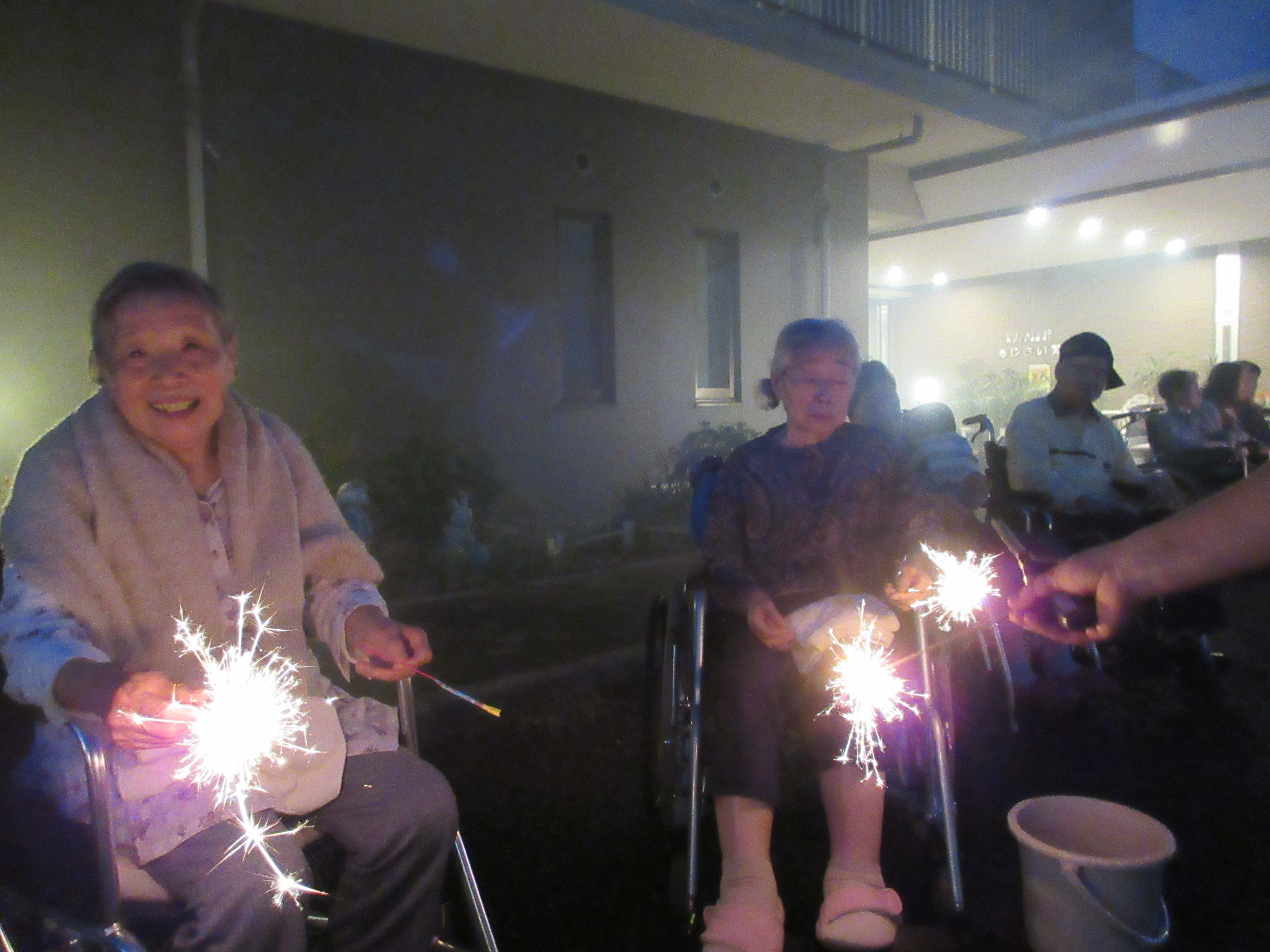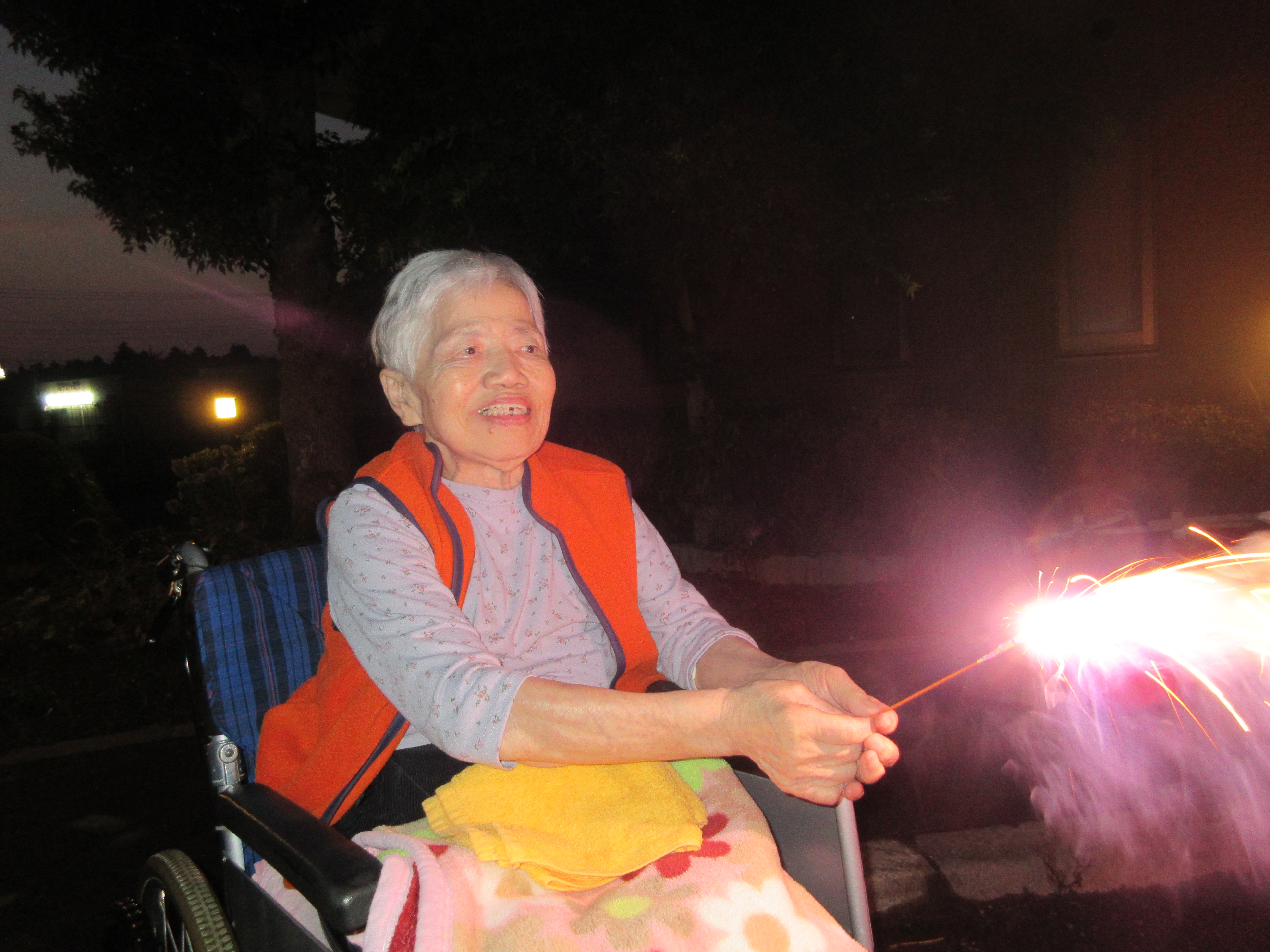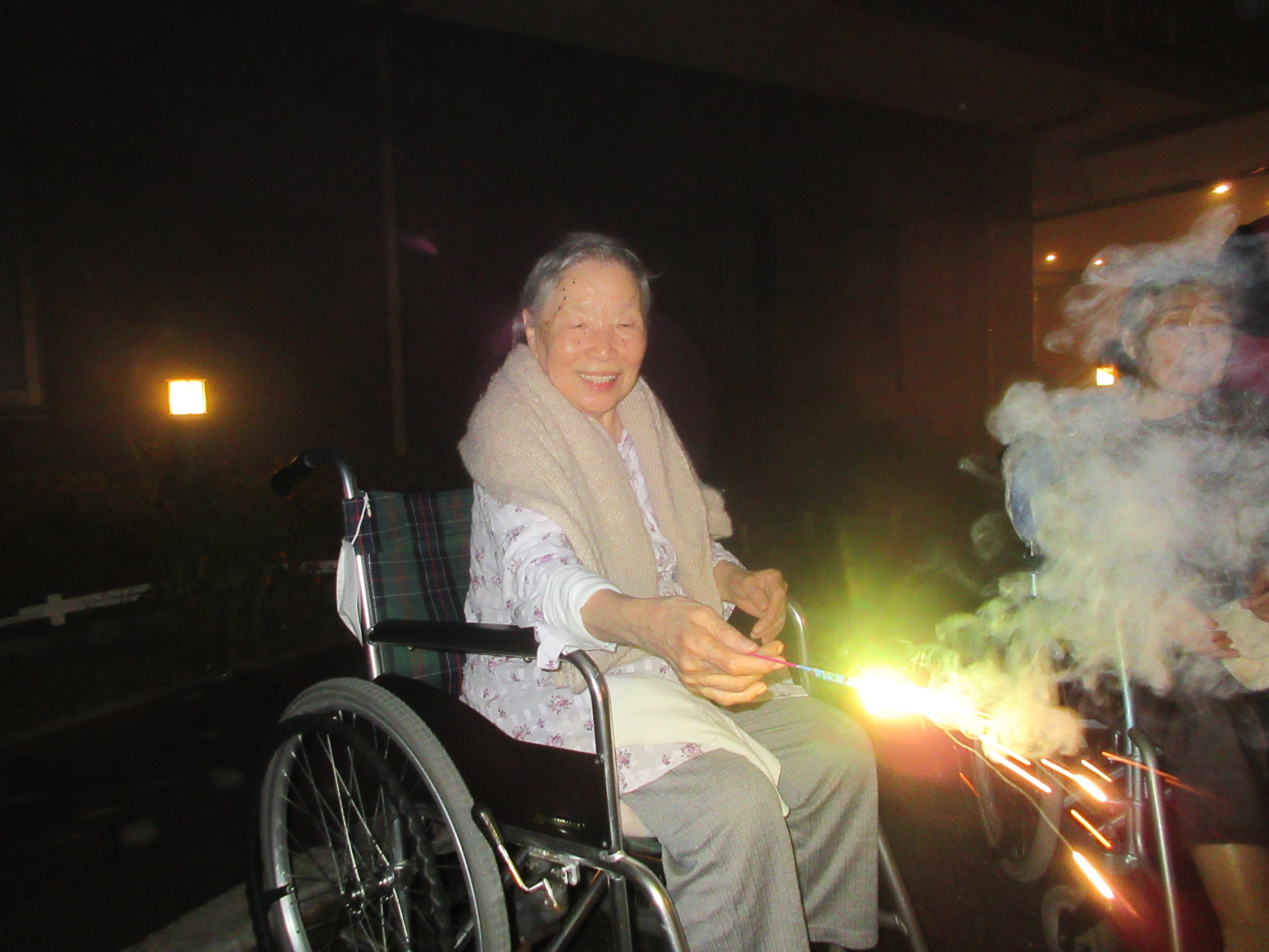 緑ユニットでは、入居者様に「緑ユニットで良かったぁ」と思って頂けるように、お一人お一人の意思を大切にし、寄り添ったケアを目指しています。ユニット内での日常を少しずつですが紹介させて頂きます(^^♪ 9月のお誕生会今月は男性2名が誕生日を迎えられました(^^♪ おめでとうございます!! 夏の終わりには花火を楽しみました(^^)/8月の誕生日会を行いました!!8月は2名の方が誕生日を迎えられました(*^_^*) 「丈夫で長生きします!」「皆様のお陰です」とのお言葉を頂きました(^^)/ おめでとうございます(^^♪
