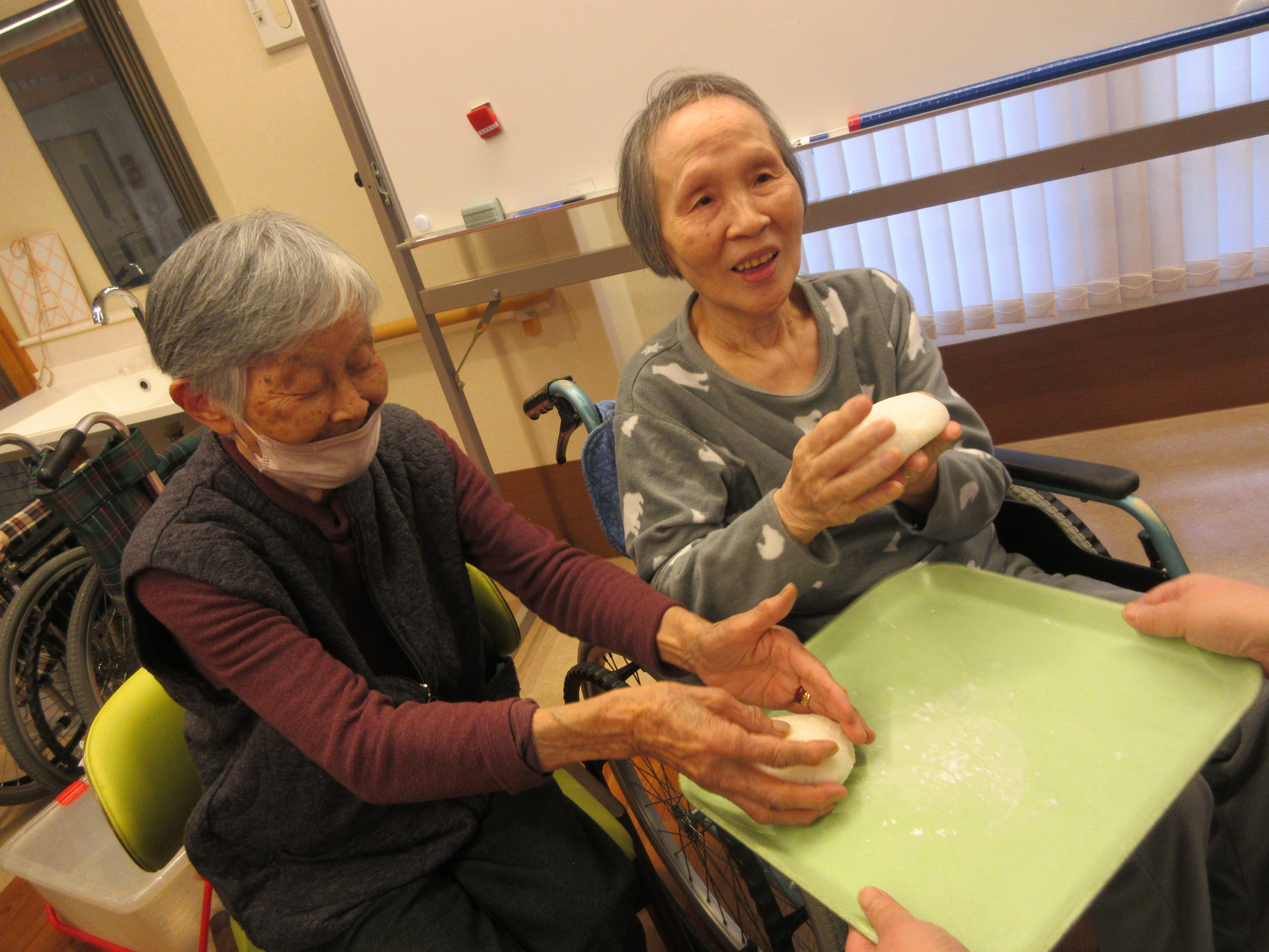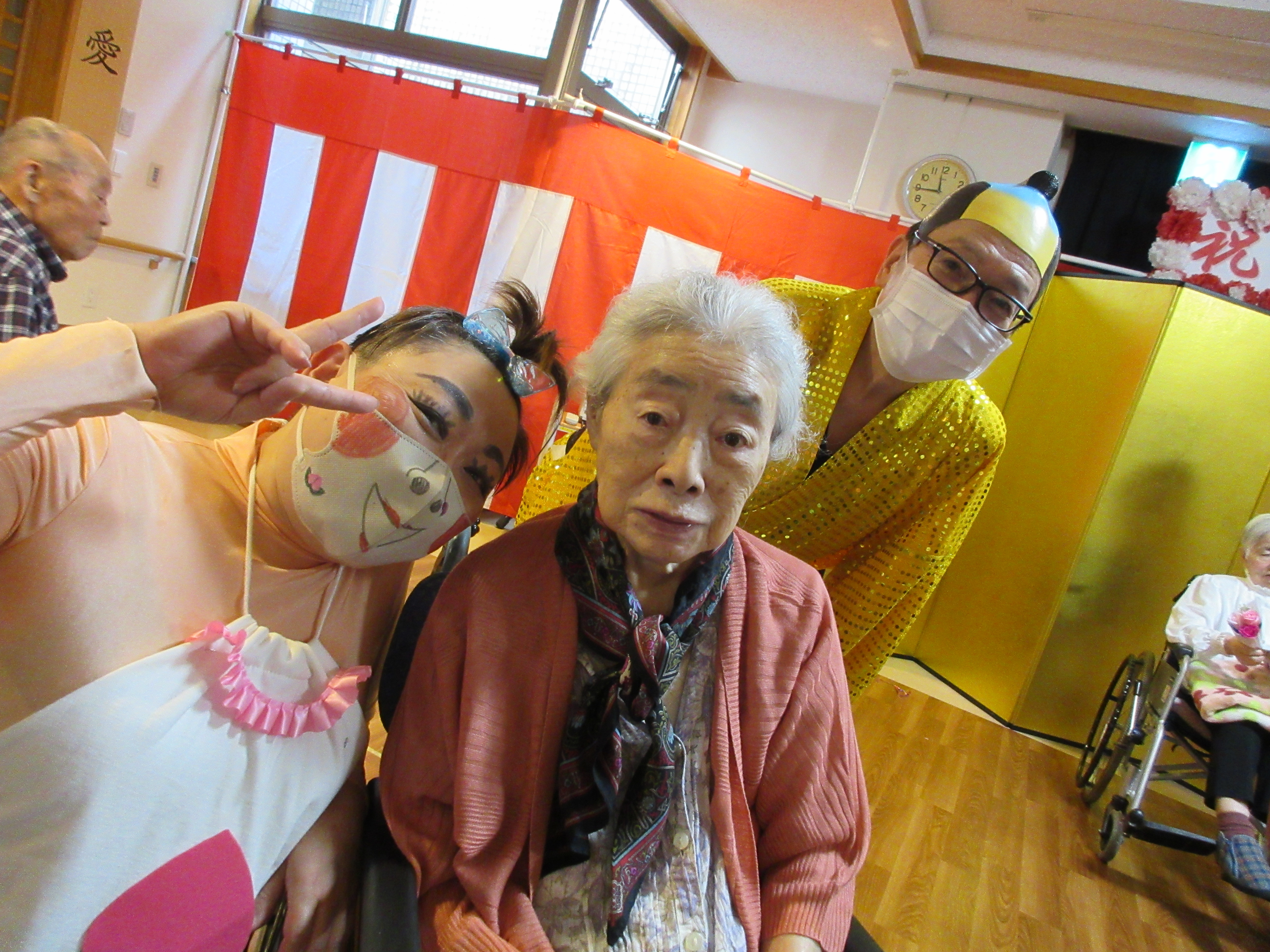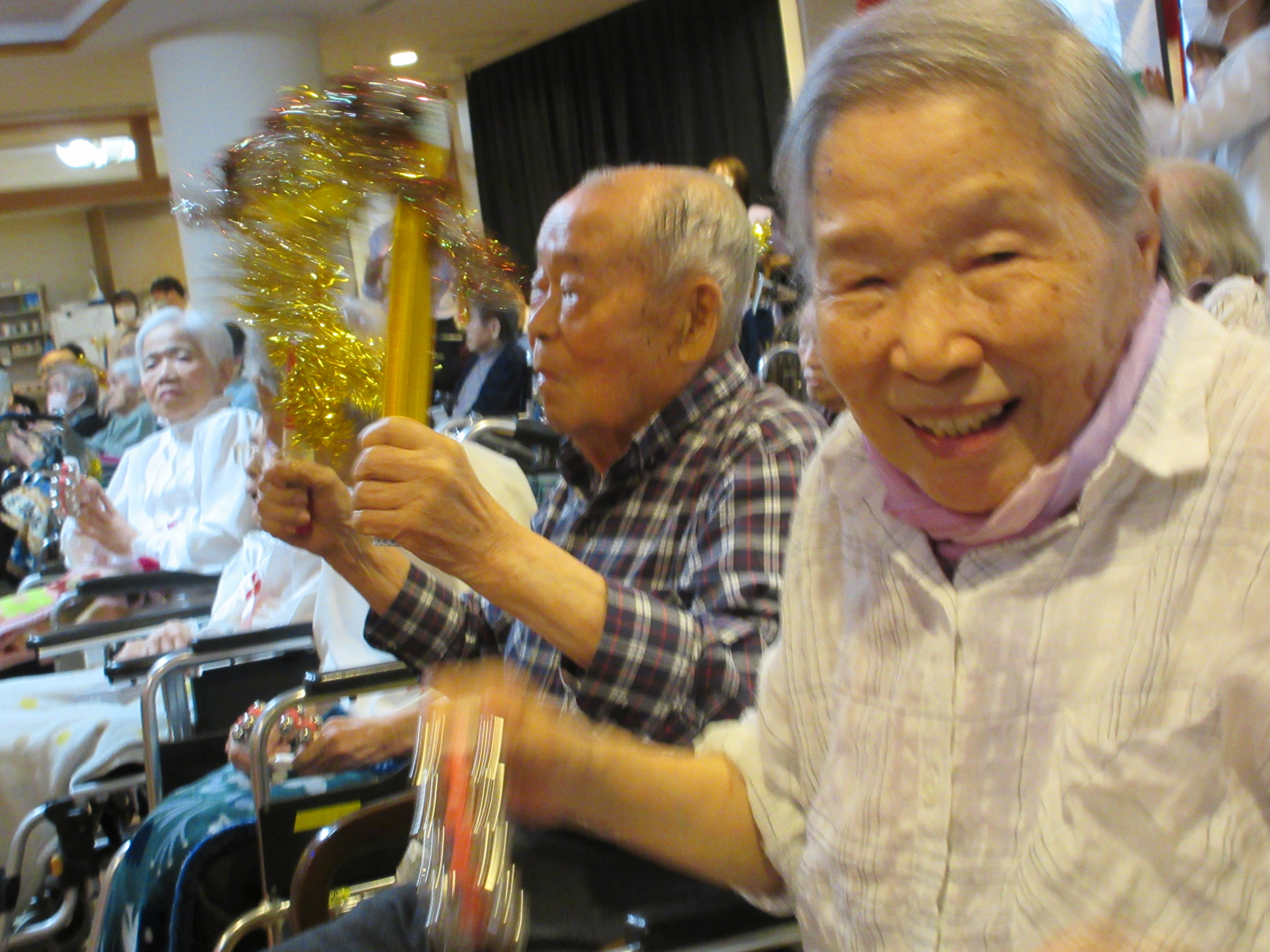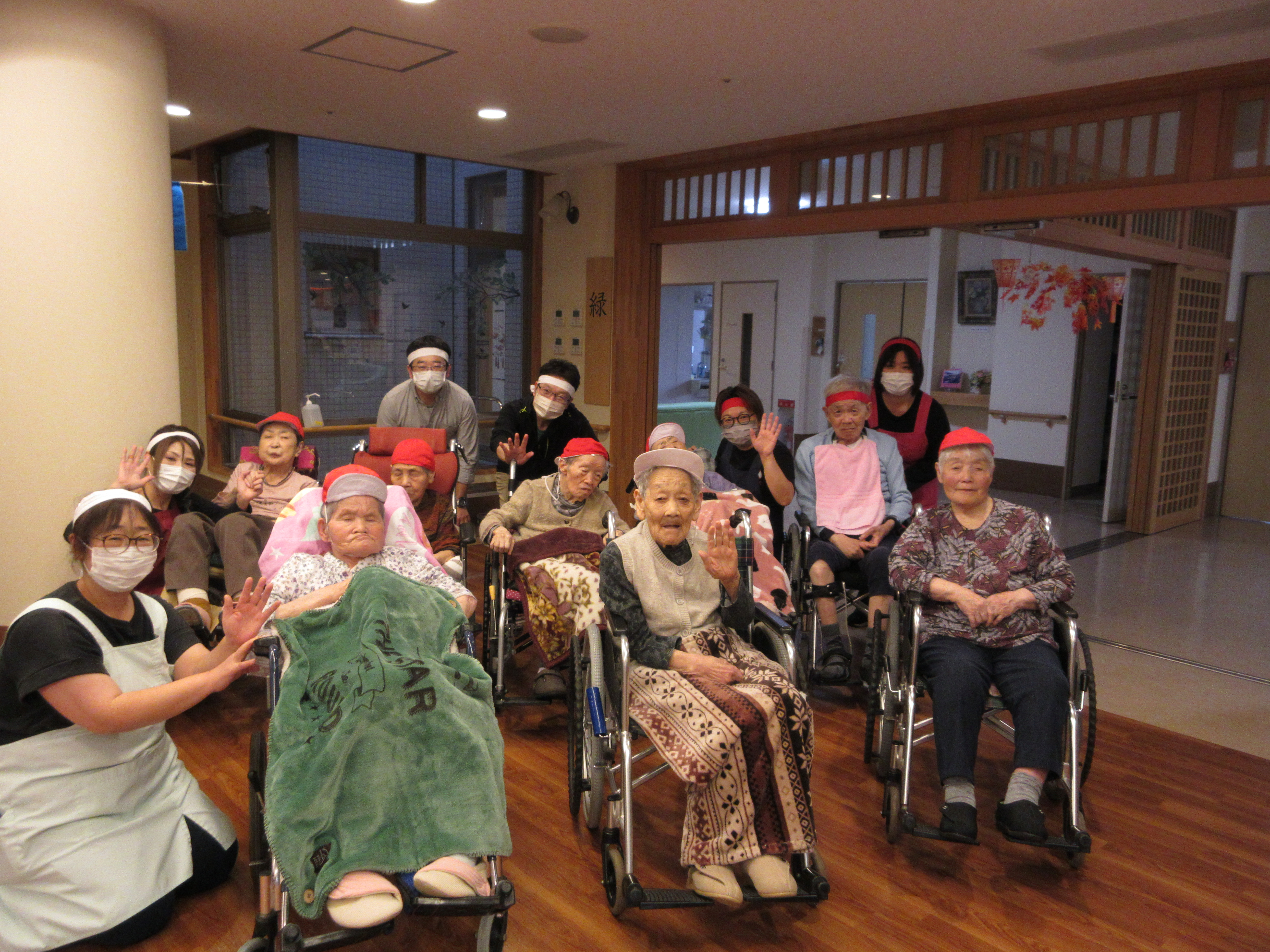 緑ユニットでは、入居者様に「緑ユニットで良かったぁ」と思って頂けるように、お一人お一人の意思を大切にし、寄り添ったケアを目指しています。ユニット内での日常を少しずつですが紹介させて頂きます(^^♪ 2026年新年あけましておめでとうございます。 本年も皆様が穏やかに過ごしていただけるよう、職員一同精進してまいります。 お餅つき出来上がったお餅で鏡餅を作りました(^^)/ クリスマス会ハロウィン運動会運動会を行いました!! まずは玉入れ(≧▽≦) パン食い競争~(^^♪ 最後は職員による二人三脚です♪♪ お疲れさまでした(^^)/ 敬老会緑ユニットでは3名の方がお祝いとなりました♪ 職員の余興は≪桃太郎劇≫でした!! 身体を張った演技に沢山の笑顔がみられました(≧▽≦) 最後は全員でマツケンサンバ♪!(^^)!♪ 昼食にはお祝い膳が提供されました(*^_^*) 9月のお誕生会今月は男性2名が誕生日を迎えられました(^^♪ おめでとうございます!! 夏の終わりには花火を楽しみました(^^)/8月の誕生日会を行いました!!8月は2名の方が誕生日を迎えられました(*^_^*) 「丈夫で長生きします!」「皆様のお陰です」とのお言葉を頂きました(^^)/ おめでとうございます(^^♪